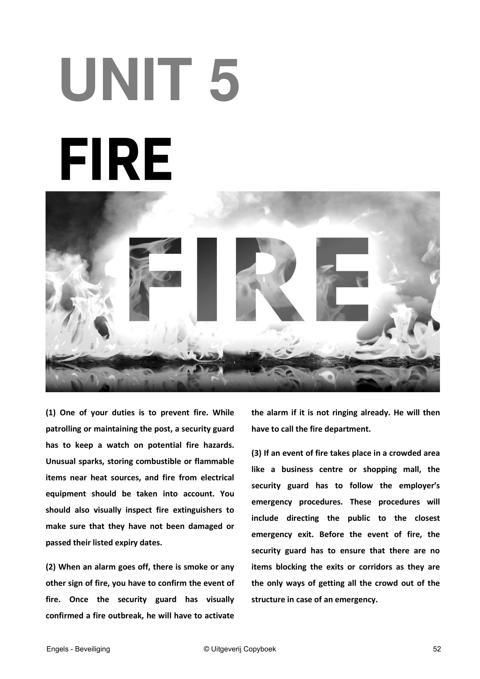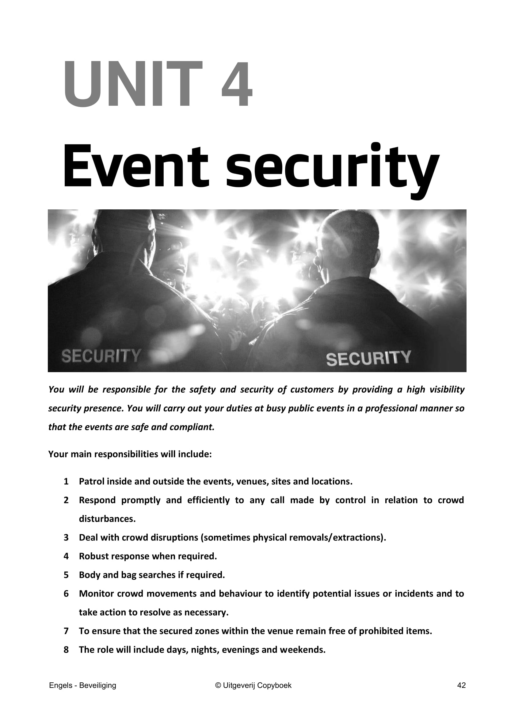 Het boek telt 120 pagina’s en bestaat uit acht hoofdstukken, met onderwerpen zoals Duties, CCTV en Event Security.