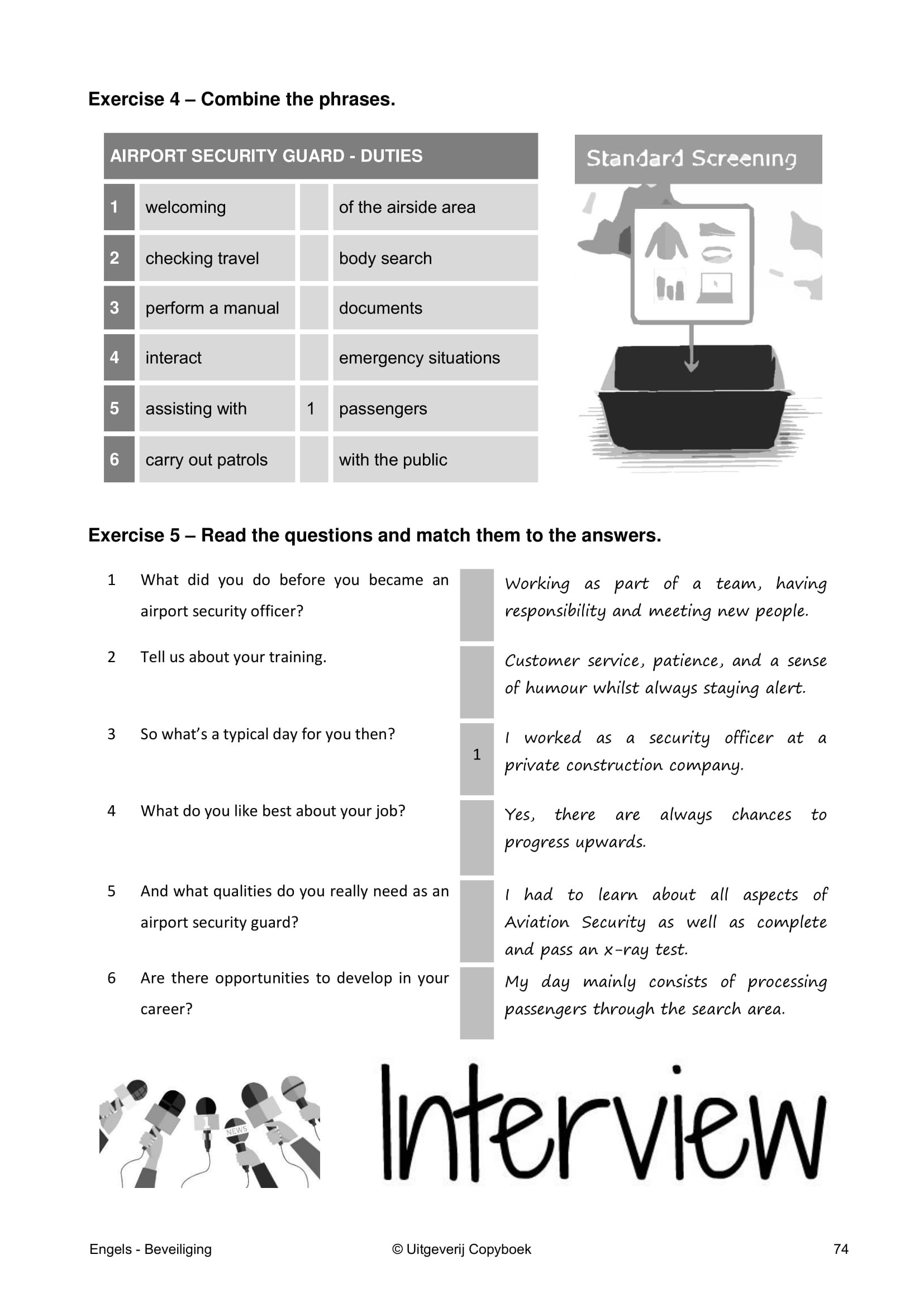 Elk hoofdstuk bevat 15 oefeningen op A2 niveau. Tevens zijn er acht voorbeeldgesprekken rondom onderwerpen zoals Access Control, Shoplifting en Directions in deze uitgave te vinden. Ook is er aandacht voor uitspraak en luistervaardigheid naast de al genoemde filmclips. Dit lesmateriaal is ook na inloggen op deze website te bekijken.